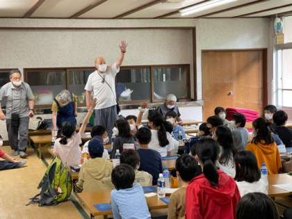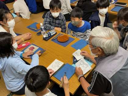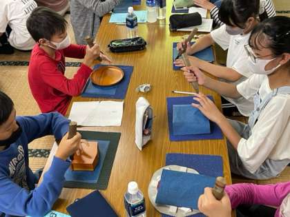 弁当をいただいた後は、日光彫体験です。講師の先生から、日光彫の伝統や特別の彫刻刀(ひっかき刀)の使い方などを教えていただきました。ひっかき刀は、線彫り用の刃物ですが、普通の三角刀と違って先端を約60度に折り曲げた「切り出し刀」を手前に引いて彫るところから「引掻き(ひっかき)」と呼ばれるようになったそうです。教えていただいた通りにひっかき刀を持つ子どもたち。子どもたちを見守るかのように、日光彫の先生たちが傍で優しく教えてくださいました。すてきな作品ができそうです。