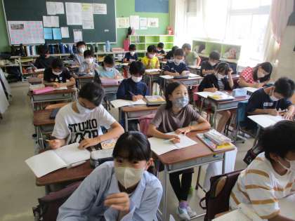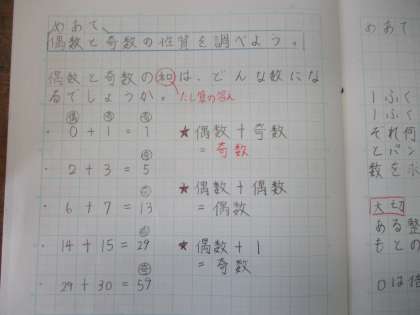5年生の算数では「奇数と偶数」を学習しています。偶数に奇数を足すと?偶数+偶数は?など、知識として覚えることと考えることを組み合わせて授業を行っていました。ノートの見やすくまとめられています。