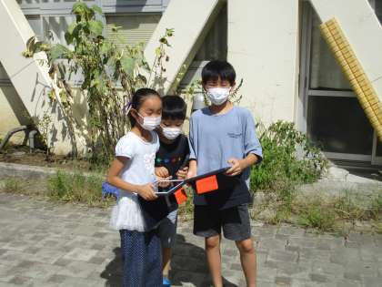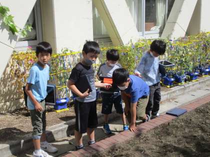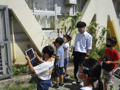 3年生の理科では校庭や花壇で昆虫探しをしました。タブレット端末を片手に昆虫を探していました。アリやチョウ見付け、撮影する仲間もいました。