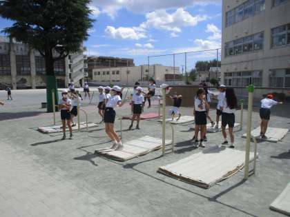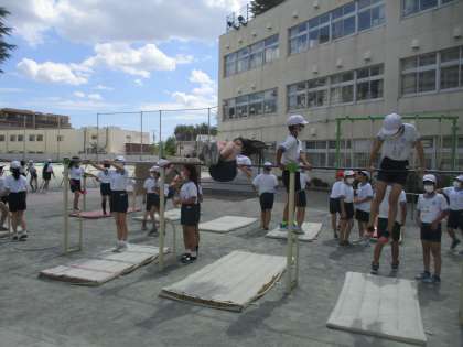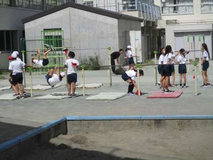 5年生の体育「鉄棒運動」の様子です。一人一人めあてに向かって取り組んでいます。そして、時折、教え合っている姿も見られました。できる技が増えると楽しくなりますよ!