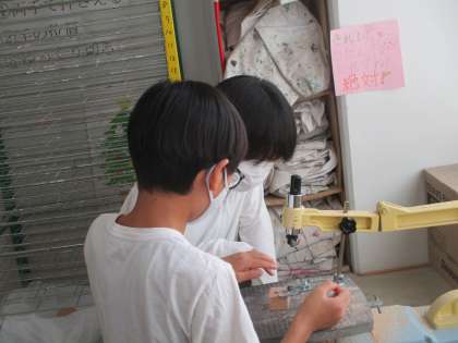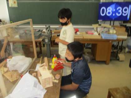 6年生図工の様子です。木を切ったり、削ったり、ヤスリをかけて磨いたり、貼ったりして夢のマイホームづくりに取り組んでいます。イメージをもって制作に励んでいます。個性あふれるマイホーム、完成が楽しみです。
