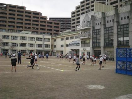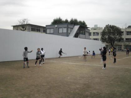 3学期に入って最初のクラブ活動です。校庭が狭くなり、校庭でのクラブ活動も譲り合って行っています。サッカー、ドッジボール、テニスのクラブです。テニスクラブは、フェンスに壁打ちをして行っていました。こうやって工夫しています。