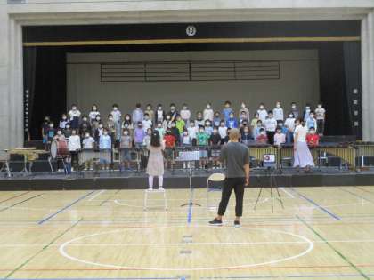 3年生の練習は体育館で行いました。それぞれの立ち位置も決まり、合唱・合奏の練習を本番と同じ状況で行いました。体育館と音楽室では歌声の響きが違います。体育館の広さに負けず、一番後方席の保護者の皆さんに届く歌声を楽しみにしています。