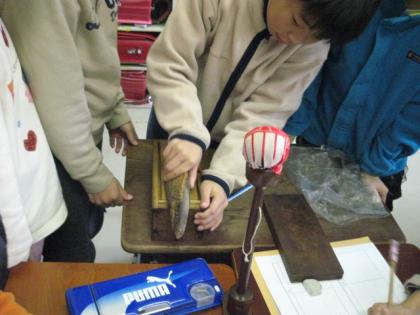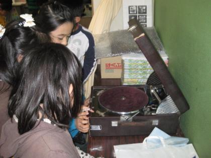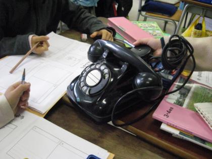 廊下を歩いていたら、昭和30年代の曲が3年生の教室から聞こえてきました。思わず懐かしくなり、教室をのぞいてみると、昔の道具がいろいろ置いてありました。社会科の暮らしの移り変わりの学習で、昔の道具を調べていたのです。ダイヤルの電話、鰹節のすり器など・・・・。子どもたちは、昔、その道具をどのように使っていたのか、体験しながら調べています