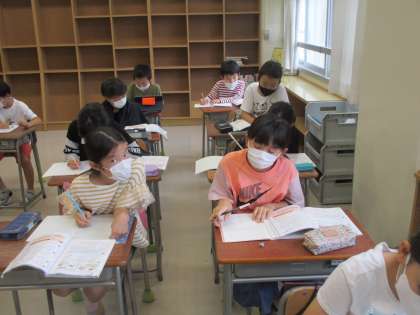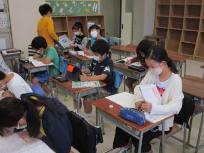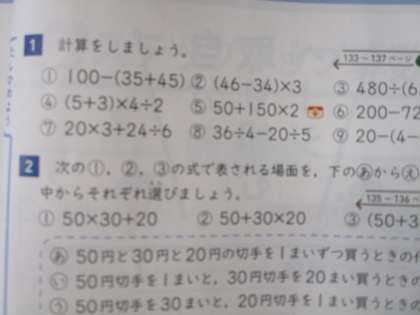4年生の算数では「式と計算」のまとめに取り掛かっています。100−(35+45)や50+150×2など、、、。計算にはきまりがあり、かけ算やわり算や( )を先に計算します。計算の手順を間違えると答えも変わってきます。テストも近いようです。4年生頑張れ!