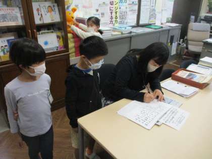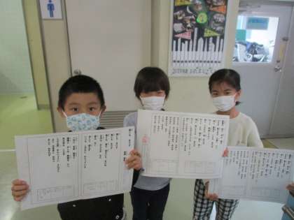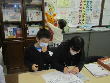 1年生の日本語の時間に宮沢賢治の「雨にもまけず」を学習しました。子どもたちは、音の響きやリズムに関心をもち何度も何度も読みました。中には暗唱をした児童も多くいて、中休みに校長先生に聞いてもらい、校長先生から学習カードに一言メッセージを書いてもらい、シールを貼ってもらいました。子どもたちの頑張りやきらりと光る努力が見られるのも小学校のよさです。