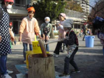 思いきねをもって「よいしょ」。みんなに応援されながらつくことができました。楽しいな。つき手のお父さんも頑張ってくれています。