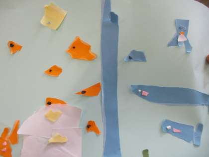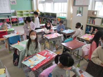 1年生の図工では「ちぎって はって」という学習をしています。画用紙をちぎって、貼っていきます。自由な発想で貼っていく中で「キリン」や「魚」、「花」など個性的な作品が出来上がりました。