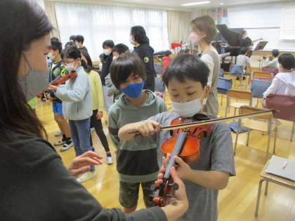 今日は、地域の方で音楽活動をされている先生をお迎えして「弦楽器鑑賞」を行いました。楽器の紹介をしていただいたり、一度は聞いたことのある曲を演奏していただいたりと音楽の素晴らしさを実感する時間となりました。子どもたちもじっくり演奏を聴いていました。また、今年は体験もさせていただき、一人一人の子どもたちが実際に手に取ることができました。貴重な体験となりました。演奏をしていただいた瀬堀さん、柴田さん、このような会の運営をしていただいたボランティアのおたまじゃくさん、素晴らしい時間を提供していただき感謝いたします。