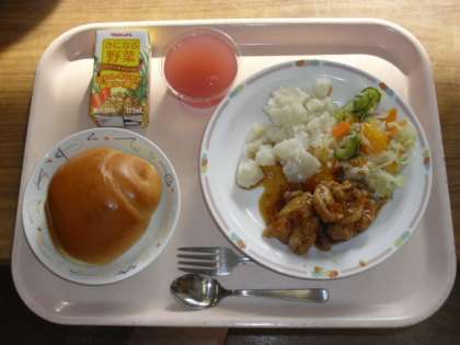 今日で、2学期は、給食が終わりです。今日の献立は、クリスマスにちなんだクリスマス献立です。「鶏肉のマーマレードソース」「グランベリーゼリー」「野菜ジュース」など、いつもと違ったメニューでした。給食主事さんは、一生懸命作ってくれました。