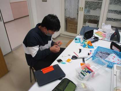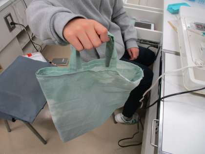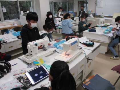 6年生の家庭科「思いを形にして生活を豊かに」では、手ぬぐいを使って作品を作っています。手縫いとミシン縫い、場面に応じて縫っています。作品も素晴らしいです。