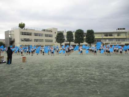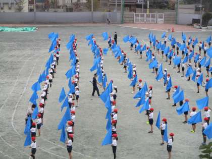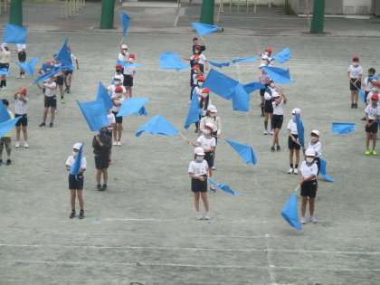 空気を切る音が格好いいです。今日はあいにくの天気でしたが、青のフラッグがとても似合っています。一日一日、一回一回の練習を大切にしてほしいです。子どもたちの成長が嬉しいです。