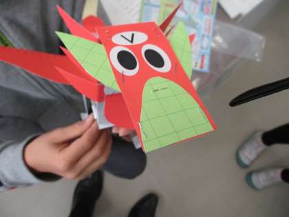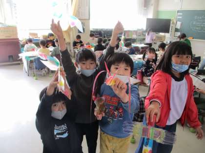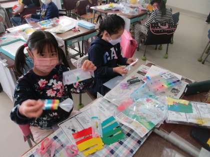 2年生図工の授業の様子です。透明のフィルムを丸めたり、切ったり、ひねったりして作りたい生き物をつくりました。オリジナルの生き物など、自分が表現したい生き物を作ることができました。