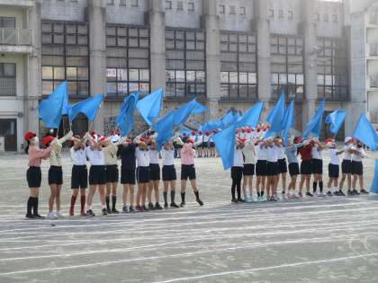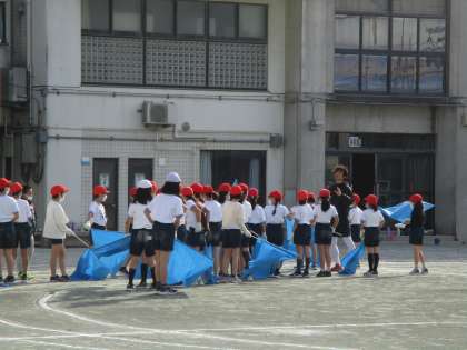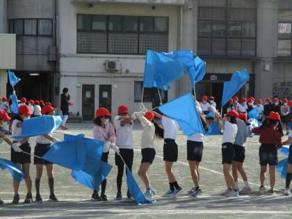 4年生はフラッグを使った表現です。「青い空に映える青い旗、一糸乱れ旗の動き、風を切る音」がすてきです。仕上がってきました。
