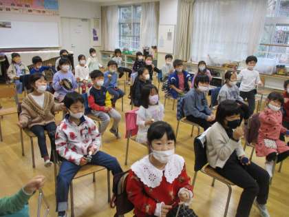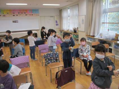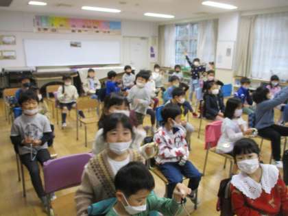 1年生の音楽の様子です。1年生の音楽、普段は教室で行います。今週は音楽室で音楽専科の先生の授業を受けています。音を楽しんで取り組んでいます。