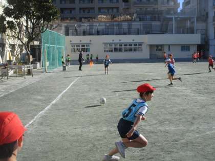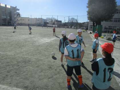 3年生の体育「キックベースボール」。寒さに負けずに取り組んでいました。攻撃チームが蹴ったボールを、守備チームがボールを捕球します。素早くボールを捕球しないと点が入ります。楽しく学習に励んでいました。