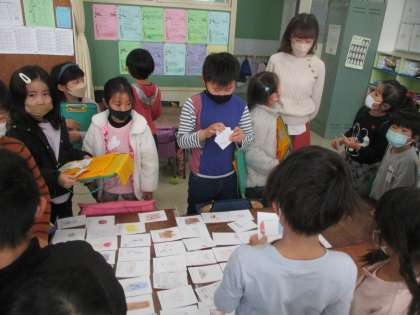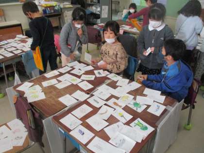 1年生の国語で「お店屋さんごっこ」をしました。子どもたちは事前に画用紙に野菜やおもちゃ、文房具、果物などの商品を描きました。その商品を売り買いして楽しみました。