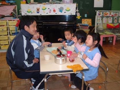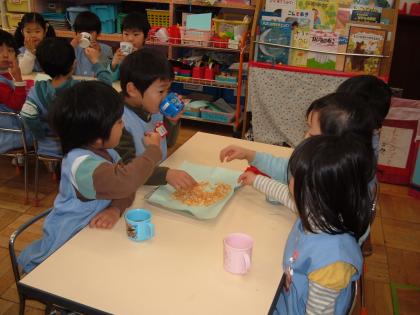 今日、幼稚園では、12月の「もちつき会」で年長さんがまるめたもちをあられにして食べました。ついたおもちをよくかわかしてあげたあられです。昔の子どもおやつだったことを覚えています。子どもたちは、もちつき会を思い出しながら、「おいしい」と言って食べていました。
