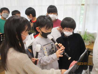 4年生の音楽の学習の様子です。リコーダーを先生の前で演奏しています。4年生、頑張ってくださいね!