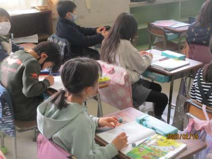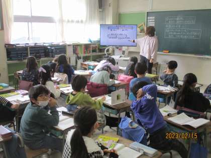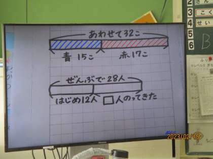 2年生の算数を参観しました。今日は、たし算やひき算を図を使って考えました。問題「おはじきの青が15こ、赤が17こ、合わせていくつでしょう」でした。大人にとっては簡単なようですが2年生にとっては簡単ではありません。子どもたちは図を見やすくかいて計算することができました。