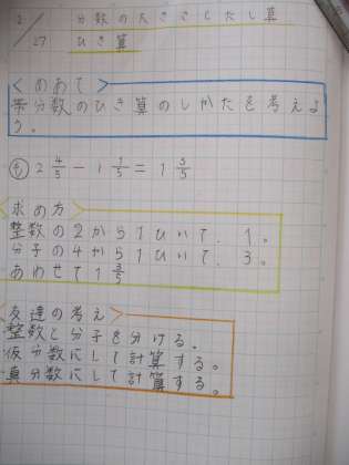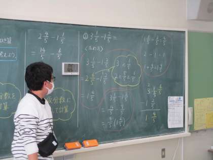 4年生の算数を参観しました。今日は帯分数のひき算の仕方を考えました。整数と分数に分けて計算をすることなど、学びを深めることができました。
