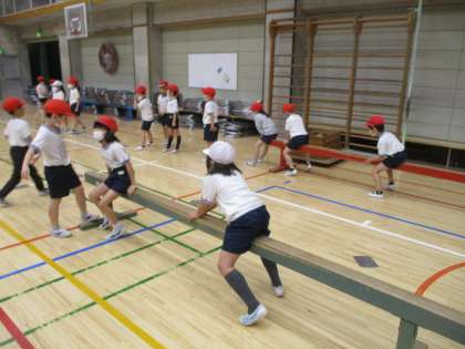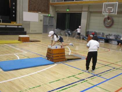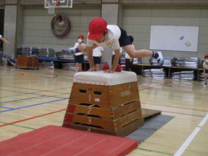 1年生の体育の様子です。マット、跳び箱、平均台があります。跳び箱も段数が違います。いろいろな場で様々な運動経験をしています。
