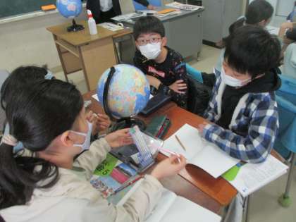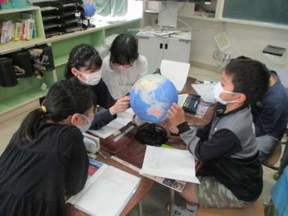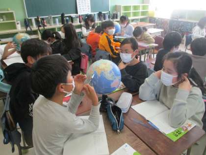 地球の衛星写真や地球儀、地図を見て、気付いたことを話合いました。地球儀をよーく見ると大陸がいくつかあります。北極と南極があります。横の線、縦の線があります。地球儀には多くの情報があります。たくさん気付いてほしいと思います。