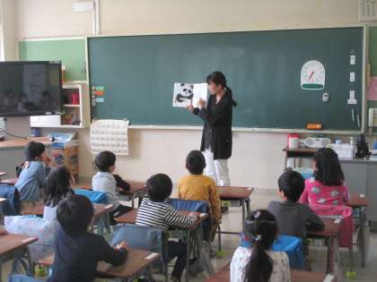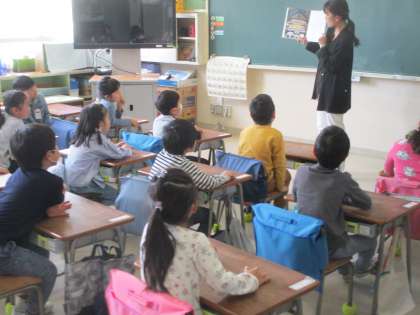 担任の先生が読み聞かせを行っていました。子どもたちは真剣に聞いています。