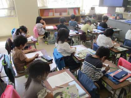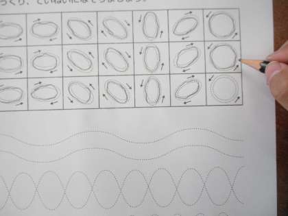 直線や曲線をていねいになぞる練習をしました。1年生のみんなは真剣になぞり書きに取り組んでいました。