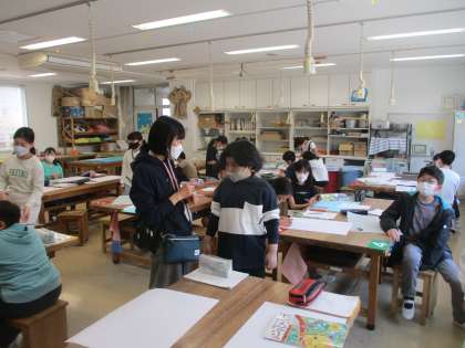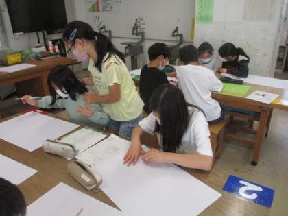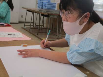 学校の隣の公園に行きました。そこで、美しい花や木を見て「季節を感じて発見したこと」を想像して表現しました。子どもたちなりに想像した季節を表現できました。