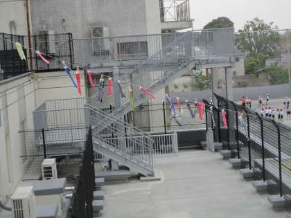 東校舎2階にこいのぼりが設置されました。主事さんが、子どもたちの健やかな成長を願ってつけてくれました。1年生の教室からよーく見えます。