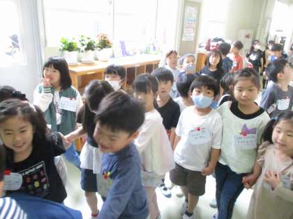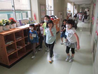 1年生と2年生が一緒に学校探検を行いました。先輩の2年生が1年生をリードし校舎を歩き回りました。写真は職員室、校長室前の様子です。
