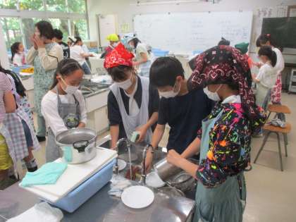 「ゆでる」ことをねらいにした調理実習を行いました。じゃがいもとほうれん草をゆでました。調理実習と言っても「調理器具を用意する。じゃがいもの皮を剥く。試食をする。片付けをする。感想を書く。」などをします。子どもたちはとても楽しく、一生懸命に取り組んでいました。