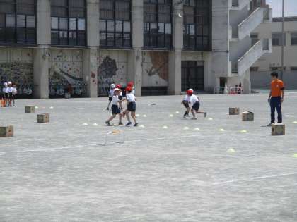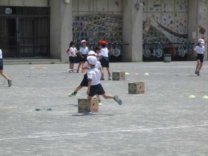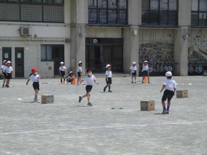 1年生の体育の様子です。かけっこを行いました。いろいろなコースを作って走りました。途中でじゃんけんをしたりするなど、授業にも工夫が見られました。