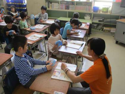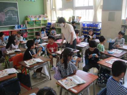 1年生の算数では「時計のよみかた」を学習しています。短い針と長い針があって1年生にとって難しい学習だと思います。授業では、友達とペアになって問題を出し合いました。楽しく学んで、理解を深めました。