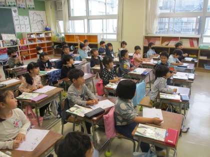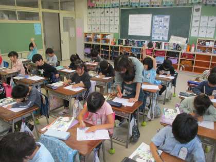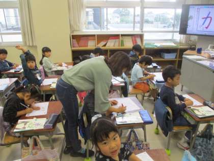 1年生のひらがな学習の様子です。今日は「か」を学習しました。一字一字丁寧に書いていました。担任も教室内を回り、一人一人の子どもに声を掛け指導しています。