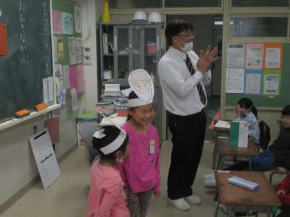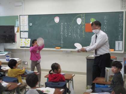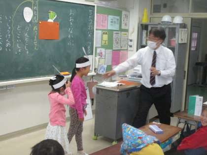 1年生の国語「おおきなかぶ」の様子です。今日の授業では、実際に子どもたちが演技をして、物語を楽しみました。「うんとこしょ。どっこいしょ。」今は聞かない表現ですが、言葉の調子を楽しんでいました。そして、国語の学習を楽しんでいました。