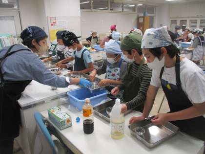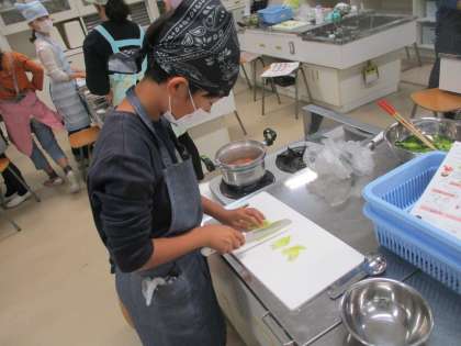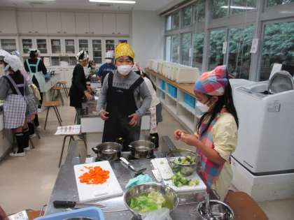 5年生の家庭科では調理実習を行いました。今日は「野菜サラダ」でした。子どもたちは一生懸命に野菜を切って、ゆでて、ドレッシングも手作っていました。安全に気を付けて、仲間と協力して実習を行うことができました。