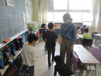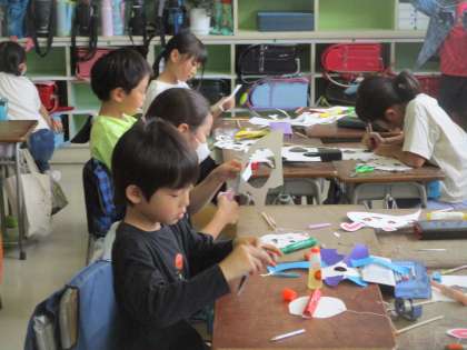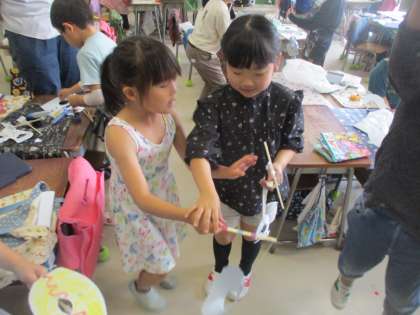 2年生の図工では「みんなでわいわい!紙けん玉」に挑戦中です。画用紙でけん玉のようなものを作り、遊びました。自分の作った作品を友達と紹介し合いました。