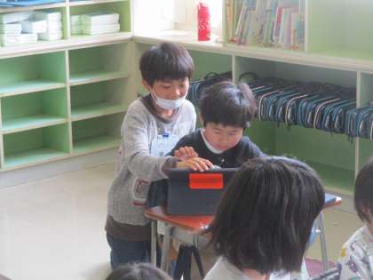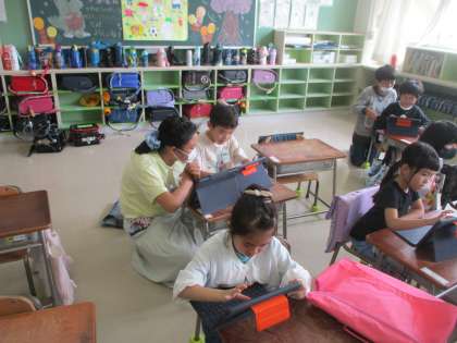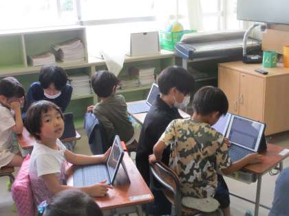 写真は、6年生が「先生」になって、1年生にタブレット端末の使い方を教えている場面です。6年生は機器の操作にも慣れて、日常的に使っています。1年生を弟、妹のように思いやさしく、丁寧に教えてあげていました。今の1年生もきっと、6年生になったら同じことをしてくれるでしょう。微笑ましい時間でした。