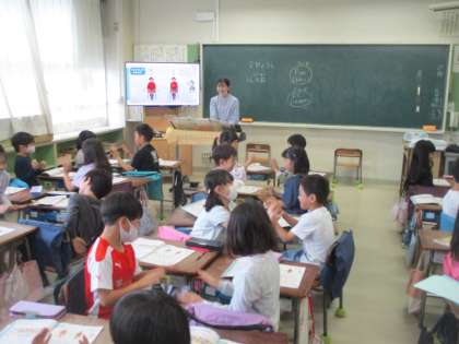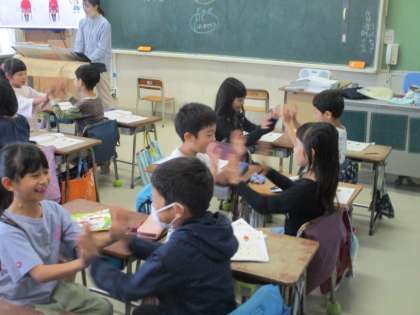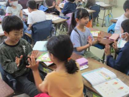 2年生の音楽の様子です。2拍子を感じながら歌いました。友達とリズムに合わせて手をタッチして楽しみました。子どもたちはノリノリです。