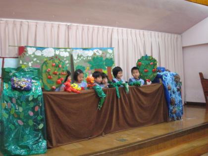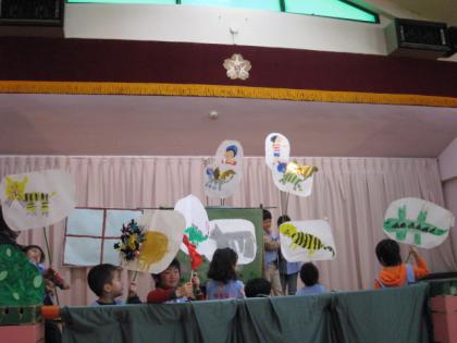 明日は、年長さんの「子ども会」があります。子どもたちが遊びながら作ってきた劇などの表現の発表をします。劇、紙芝居、人形劇など、バラエティーに富んだ表現になっています。子どもたちが楽しみながら行っている様子をどうぞ見に来てください。今日は、グループごと最後の練習をしていました。