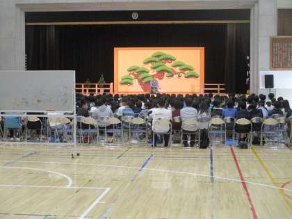 6年生対象に古典芸能鑑賞教室が行われました。千歳小との合同開催でした。狂言のワークショップを体験し、「附子」を見せていただきました。セリフの言い方、所作などを教えていただきました。貴重な時間となりました。