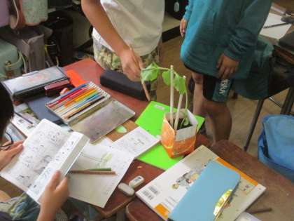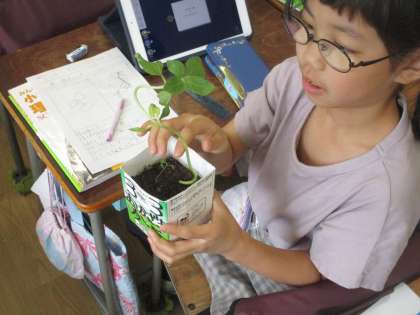 3年生理科を参観しました。今日は「ホウセンカとヒマワリ」の観察をしました。植えてから時間もたちだいぶ大きくなってきました。長さや葉の枚数、形、手触りなどについて学習カードに記入しました。花が咲くまではもうしばらく時間が掛かりそうですが開花を楽しみにしています。