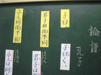 教科「日本語」の授業でした。論語です。「君子は和して同ぜず。小人は同じて和せず」の学習です。子どもたちは、難しいけれど、この言葉から類推して、本当によく考えているのには驚きました。また、音読を楽しんで読んでいる姿も素敵でした。1組の素晴らしさを感じた1時間でした。