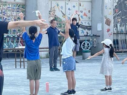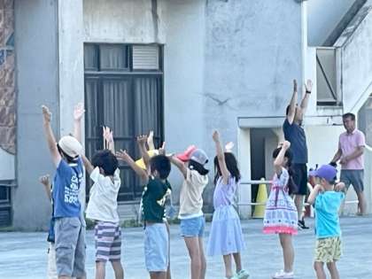 朝日がふり注ぐ中、今日もラジオ体操をがんばっている子がたくさんいます。