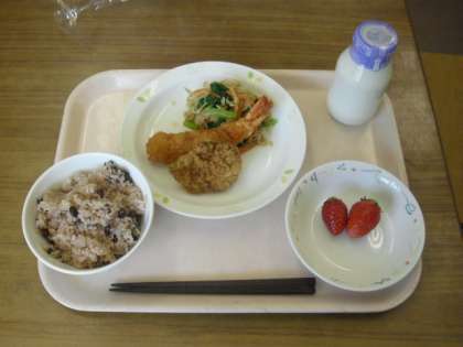 今日で給食が最後です。修了のお祝いにお赤飯と、子供たちの大好きな海老フライとひれかつでした。各クラス、最後の気持ちで楽しく会食しました。