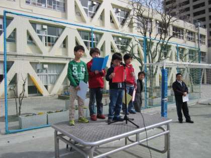 今日は、修了式です。校長先生の「今日は自分をほめる日」「成長を助けてくれた人に感謝する日」という話を聞きました。1年生と5年生の代表のスピーチがあり、校歌を歌って式が終わりました。