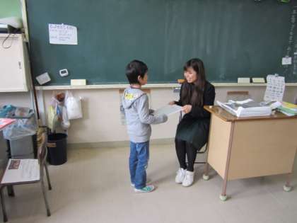 教室に帰ってから、「あゆみ」をもらいます。先生にがんばったことを一人一人話してもらいながらあゆみをもらいます。先生や友達に自分の成長をほめてもらえるうれしい時間です。