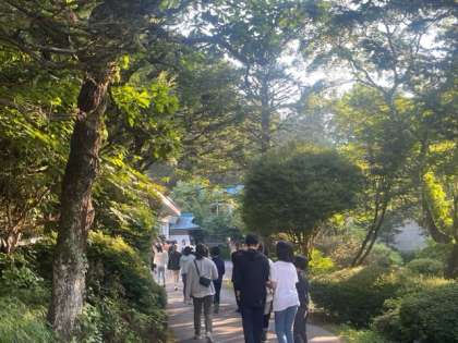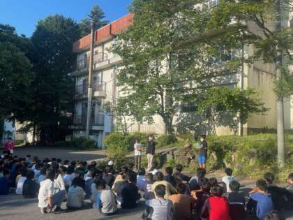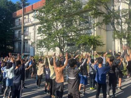 6時30分から朝会を行いました。朝の目覚めのラジオ体操もがんばりました。朝会を行う広場から宿舎に向かう風景も緑の自然がいっぱいです。